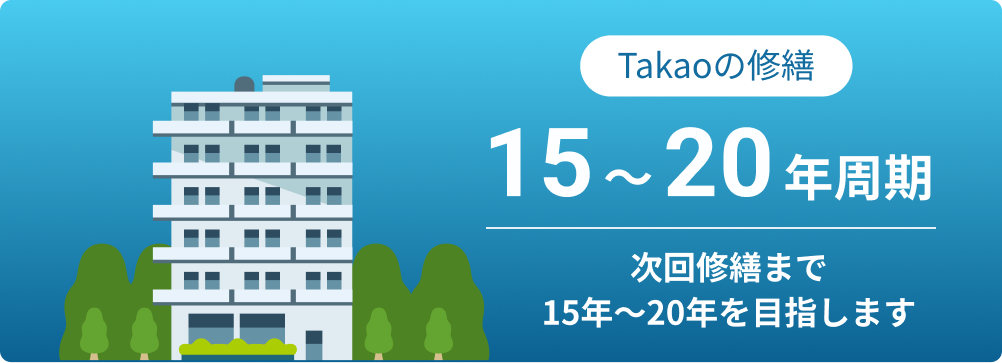一般的にマンションの大規模修繕工事は約12年周期とされています。しかしその周期は施工品質によって変わると私たちは考えています。Takaoプランニングでは、・外壁タイル補修時の注入数の最適化・防水工事の下地処理の徹底・シーリング施工精度の向上など、見えない部分まで丁寧に施工することで、次回修繕周期の延伸を目指しています。単に修繕を行うのではなく、次の修繕までの期間を長くする施工それがTakaoの大規模修繕です。