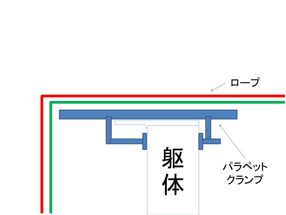 左図のようにクランプをセットし、笠木にかかる荷重を避けた上でロープをセットすることで笠木の破損リスクを無くし実施いたしました。